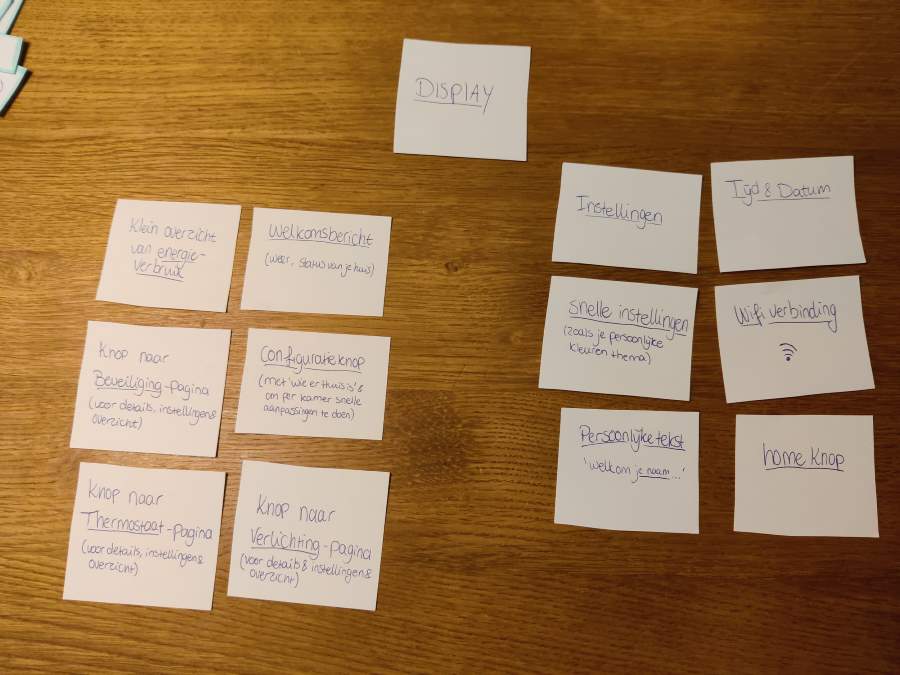 Ik heb card sorting toegepast als methode om er achter te komen hoe de doelgroep de onderdelen van de app zal categoriseren en in welke volgorde. Dit heeft mij geholpen de content van de display op een logische manier te structureren en er achter te komen welke onderdelen als eerst zichtbaar moeten zijn.