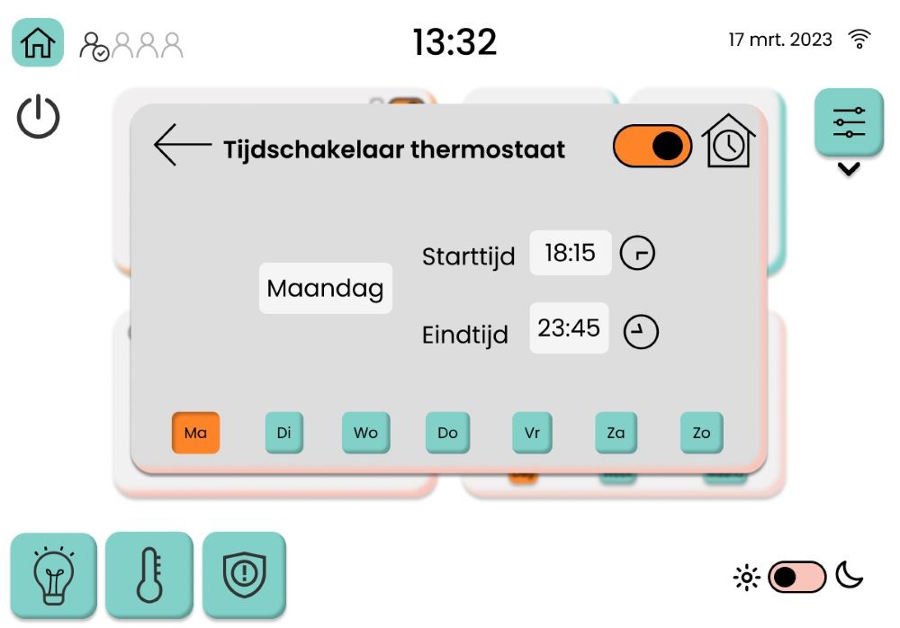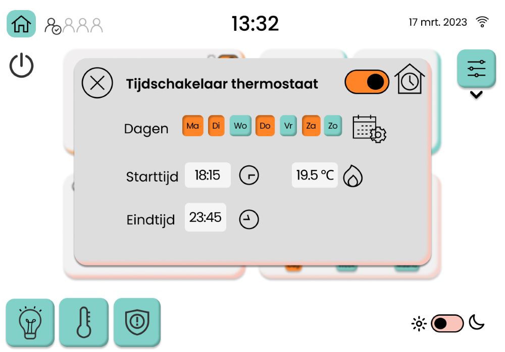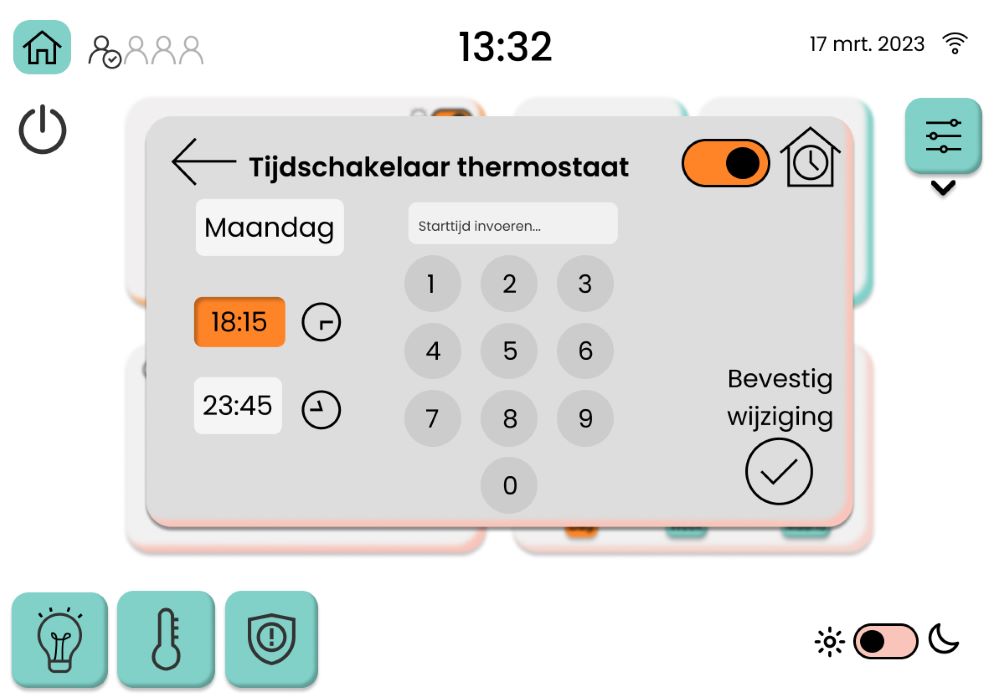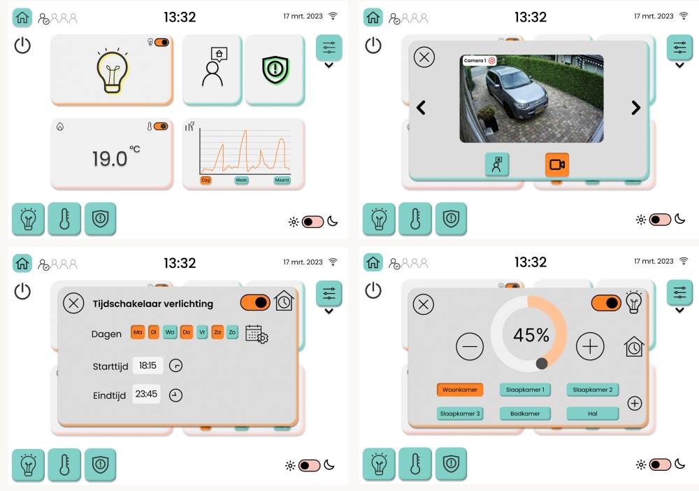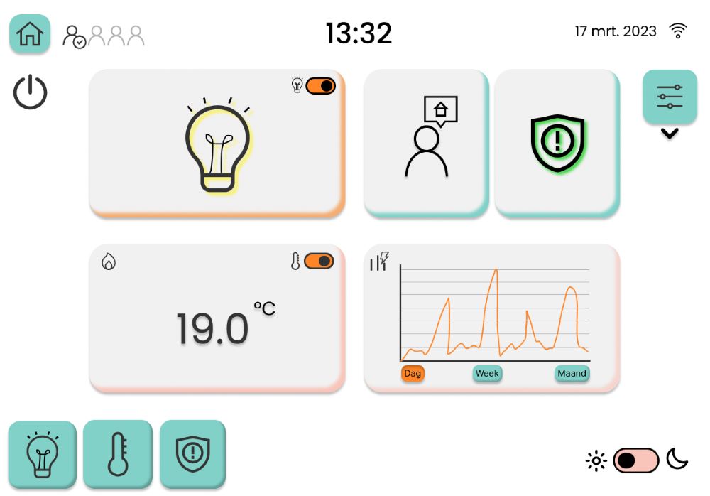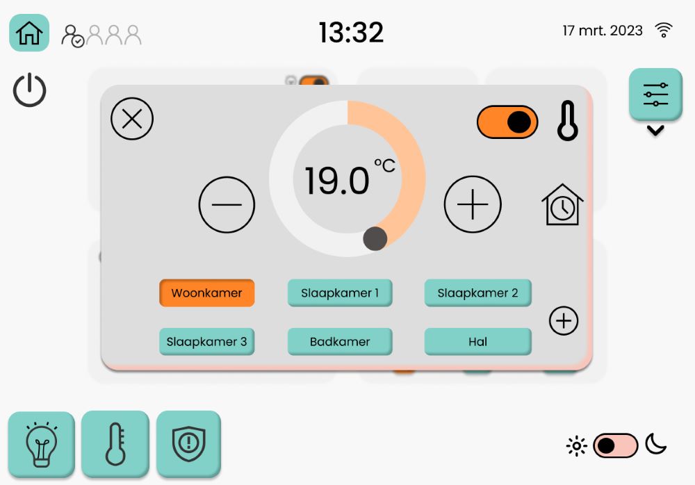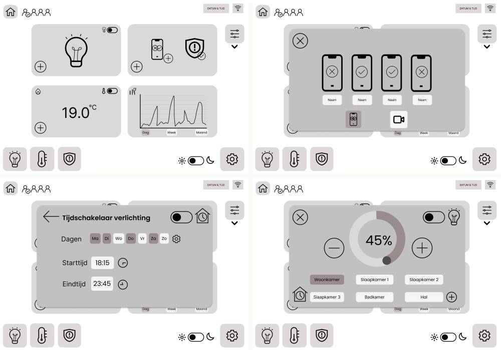 Mijn verantwoordelijkheid lag bij de display & navigatie in het systeem. Het doel waarbij ik naar toe wilde werken was de basis instellingen voor de onderdelen thermostaat, beveiliging en verlichting voorin de app plaatsen, zodat deze eenvoudig te besturen en gebruiken zijn.