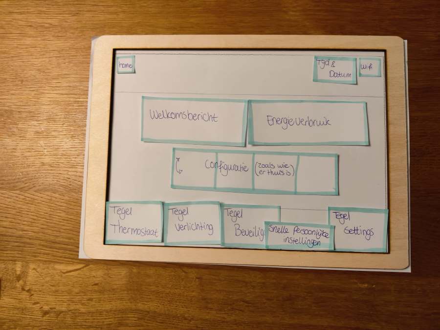 Ik heb met de lasersnijder een houten frame gemaakt waarmee ik een tabletschermformaat heb nagebootst. Ik heb gebruik gemaakt van papieren knoppen en elementen. Deze heb ik in verschillende groottes uitgeknipt om zo achter te komen hoe, waar en welke onderdelen terug moesten komen in de display. Hierbij heb ik alle design requirements verwerkt. Hiermee kon ik vervolgens snel verschillende tests uitvoeren.